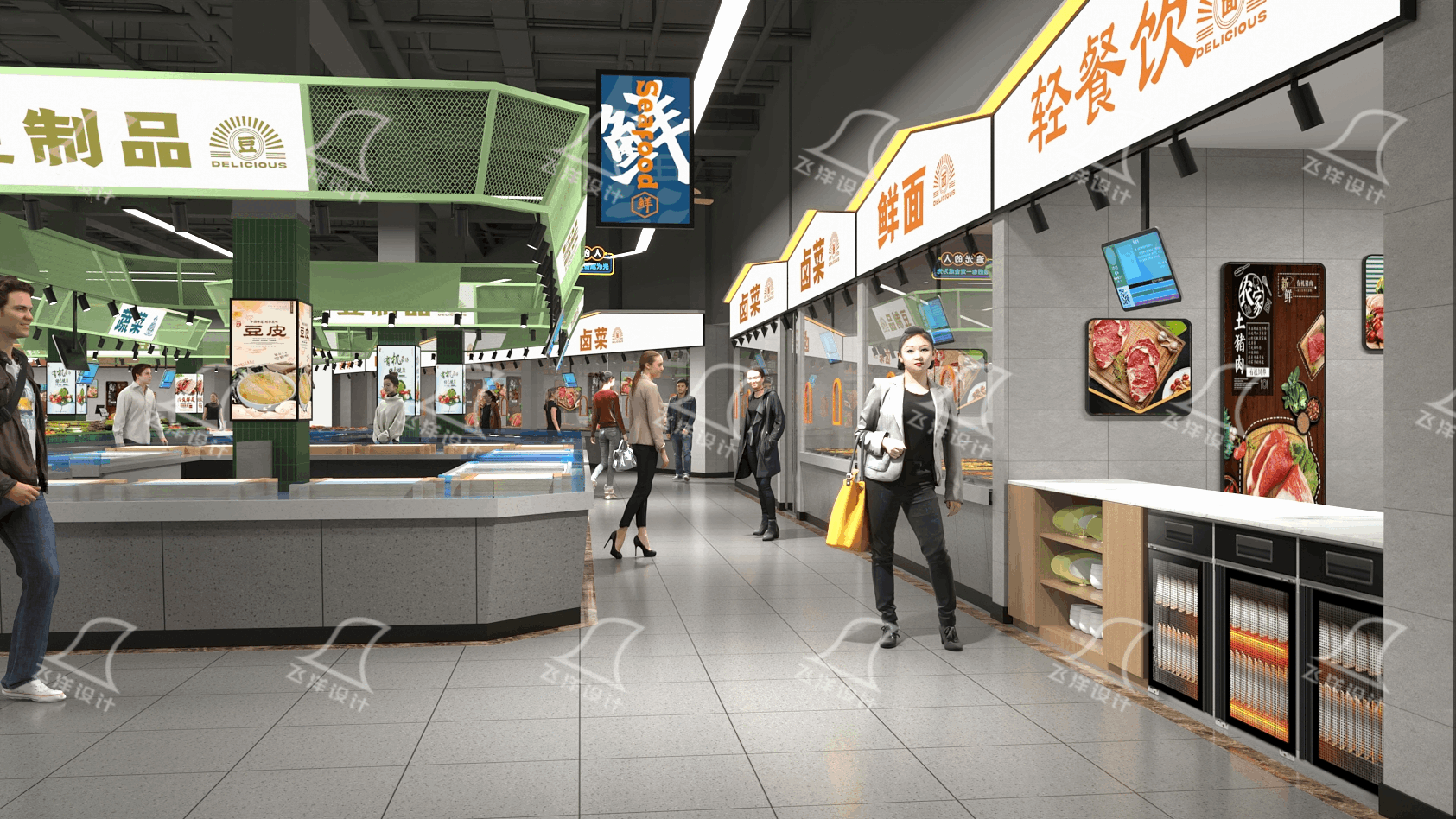 利用色彩進行功能分區,是提升市場設計感與實用性的核心技巧。不同品類區域應采用不同的色彩策略,從而潛移默化地引導客流。