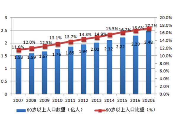 (國(guó)家統(tǒng)計(jì)局:2007至2020年60周歲以上老人人口占比增漲圖)