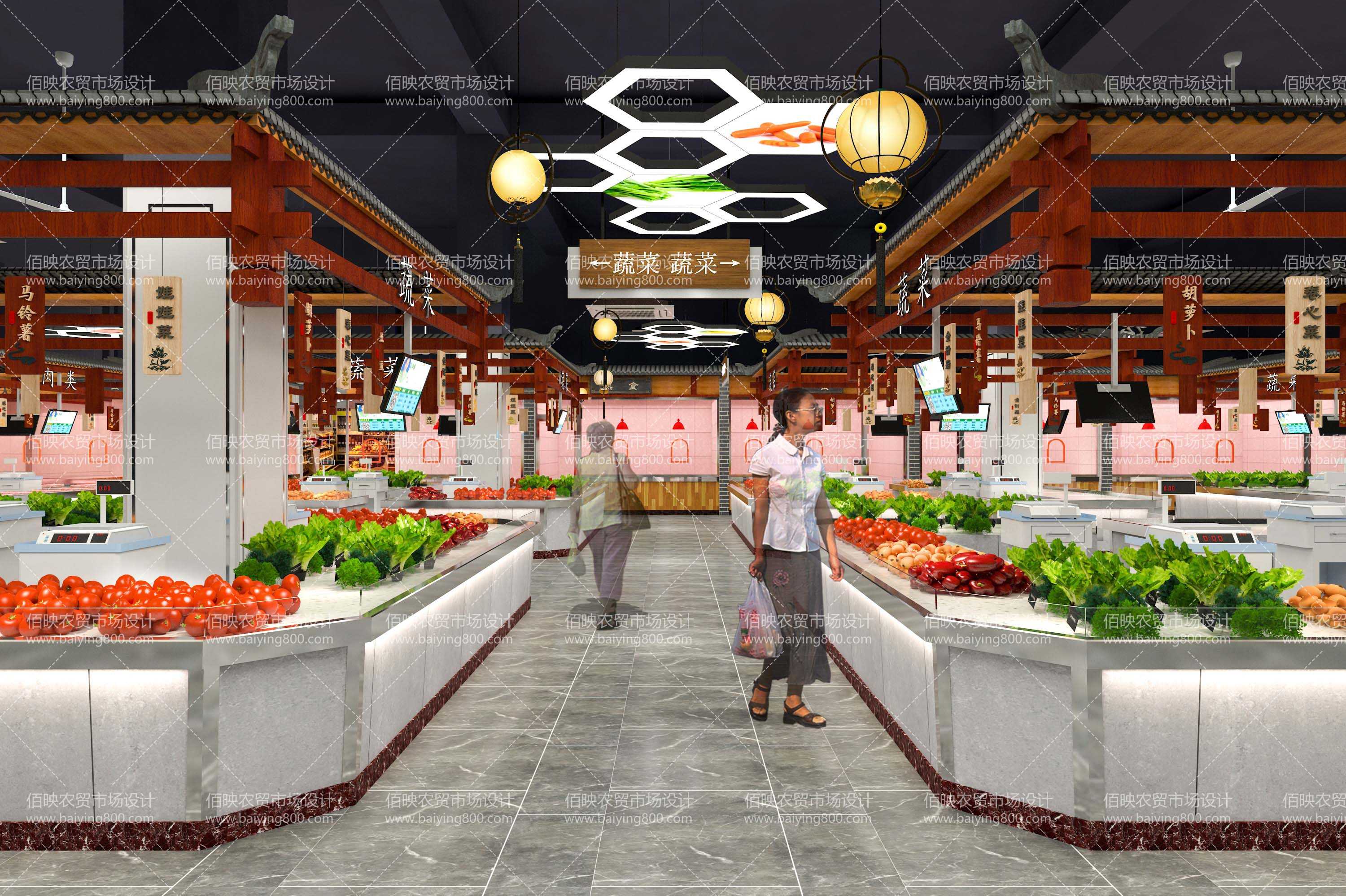 市場的攤位被劃分為單元格,長租、出售;為了便于銷售,農市場往往基礎設施不會過差,甚至銷售類市場中也有主題明確的中高端市場。在利益的催動下,也應運而生了一批網紅菜場、高端智慧市場,開創了資本快消時代的新篇章,這一篇章不可謂不壯闊,也不可謂不實用,從各角度高效地完成了新一輪市場的變革;但從新農貿車輪的倒影上細細看去,竟然驚人地如出一轍!究其根本,絕大部分網紅市場的文化風貌,均是復制粘貼的批量產物,仿古之風、暗色調之風、仿盒馬之風橫行,無論身處何地,不管不顧就是仿古,瓦片、屋檐、燈籠一時確實新奇,但千篇一律之后不免審美疲勞。更有甚者一套設計模板可以運用于任何項目,從最初的駭人聽聞,到現在被廣泛接受,甚至被認為物美價廉。