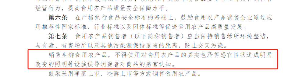 該《辦法》第七條第二款明確規(guī)定:銷售生鮮食用農(nóng)產(chǎn)品,不得使用對食用農(nóng)產(chǎn)品的真實色澤等感官性狀造成明顯改變的照明等設(shè)施誤導(dǎo)消費者對商品的感官認知。否則將面臨最高三萬元的處罰。