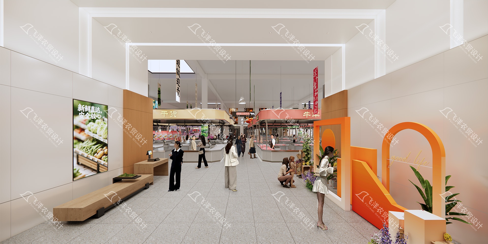 采用低矮、開放的攤位設計,最大限度保持空間視野的開闊與通透。重點強化自然采光與機械通風,特別是針對水產區等特殊區域,確保空氣清新,營造健康舒適的室內環境。