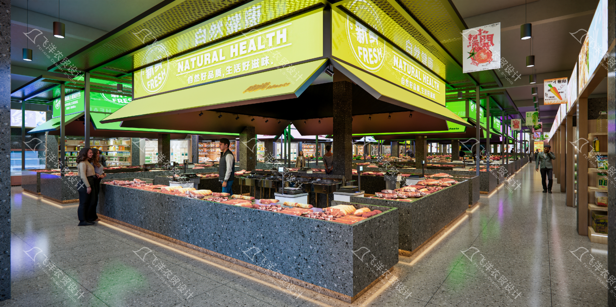 視覺基調:采用淺色系與自然肌理材質,營造明亮、開闊、潔凈的“自然鮮感”氛圍。通過“FRESH”、“HEALTH”等關鍵詞的視覺強化,將食材的健康品質延伸至空間氣質。