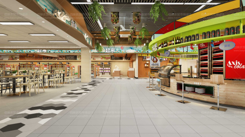 色彩是影響視覺效果的最重要因素,在效果圖制作中,設計師需要把控好色彩的搭配及運用,優秀的效果圖會非常注重空間色彩對比,讓色彩來突出空間立體感。另外,不同業態需要使用不同色彩來凸顯農產品自身特色。